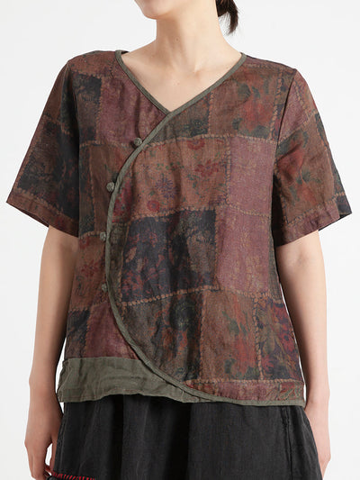 Plus Size Vintage Floral Ramie Casual Summer Women Shirt